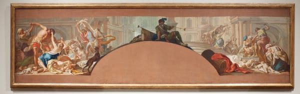 Christ asks the Samaritan woman to give him water to drink. She is taken aback because Jews did not associate with Samaritans. He speaks to her of the water of life that cures all thirst and reveals himself as the Messiah. The maker of this metalcut used punches, gouges, and engraving tools to produce a rich array of textures that give the surface an animated character. The textures enabled the image to compete with completely hand-painted imagery despite being colored with a very limited palette. Prints of this scale and sophistication were sometimes pasted into books as supplementary illustrations, which is why they have survived for more than 500 years.