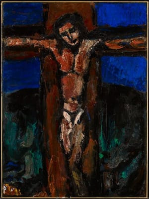 The work features the crucifixion scene with Mary, John, and a clerical figure. It is part of the European Art collection at the Minneapolis Institute of Art, where it has been since 1979. The painting has changed hands several times, most notably when it was sold in Paris in 1954 before reaching the museum.