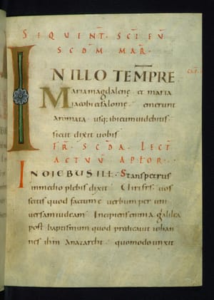 This Lectionary was created ca. 1000 in Trier. Written in a clear Caroline minuscule, it contains decorated initials at the openings of important readings. A set of illuminated letters marks the beginning of the Epistle and Gospel lessons for Easter; they display the hierarchy of scripts with capital letters decorated with gold leaf or drawn in red ink, followed by uncial and Caroline minuscule. Initials in orange, sometimes filled with gold, mark the divisions of the text. The book has been stylistically compared with Ottonian manuscripts, especially with a Psalter preserved in Trier (Stadtbibliothek, Ms. 7) illuminated by the so-called Master of the Registrum Gregorii.