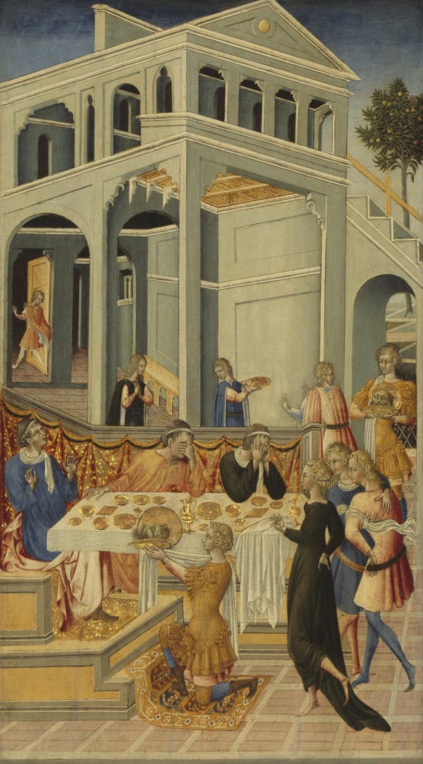 The color palette is rich with deep reds, greens, and blues, and the use of gold indicates the painting may have been intended for a wealthy patron. The clothing of the figures, with its detailed folds and shadows, showcases the artist's skill in depicting luxurious fabrics and textures. This painting is a fine example of the synthesis of Gothic tradition and the emerging Renaissance style, capturing a moment of intellectual and theological significance with both artistic finesse and devotional clarity.