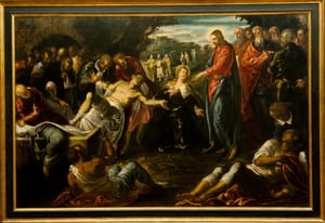 The Virgin Mary sits on a stone bench. A halo of light around her head cuts through the shadows of the space. She looks tired and pensive as she cradles the baby Jesus in her lap. Any new parents can recognize the exhaustion and the weight of responsibility. She rests her head against her closed right hand, a traditional sign of melancholy. Jesus looks up at a bird flying in the upper left corner of the image. The bird is tethered by a string, which Jesus holds in his right hand. The bird may symbolize the soul, which is only tenuiously held by the body. Mary's prefigures the sadness she will fell after the Crucifixion. source: artsmia.org