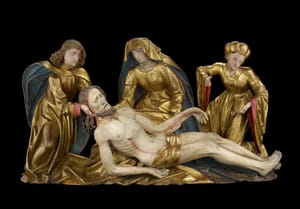 Saint Ambrose, who lived in the fourth century, was an important Christian scholar and bishop. Here he is depicted among his books in a forceful pose emphasized by his massive hands. On the table’s edge, a scourge, or whip—the knotted rope attached to a wooden rod—symbolizes Ambrose’s fight against heresy. The three knots refer to the doctrine of the Trinity, the concept of one god in three persons: Father, Son (Jesus), and Holy Spirit. Claude Vignon made this painting upon returning to Paris after spending over a decade in Italy. The saint’s sumptuous clothing and luminous gold miter (headdress) display a delight in color typical of Vignon’s work from this period. source: artsmia.org