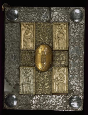 This is a fragment from the upper arm of a hand-held bronze cross. One side contains a bust of Saint John the Baptist. The other side displays a cross-shaped monogram whose letters form the word KYPIE, vocative of "Lord" - probably the beginning of an inscription that once read "Lord, help [name of the donor]".